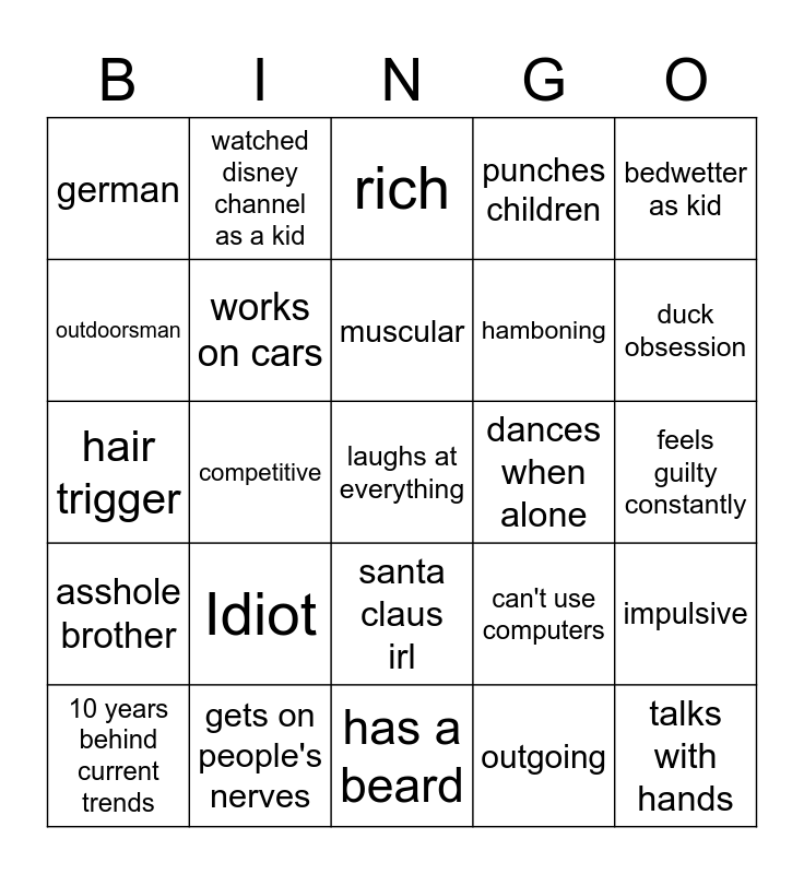 This bingo card has a free space and 24 words: Idiot, gets on people's nerves, muscular, 10 years behind current trends, bedwetter as kid, german, outdoorsman, watched disney channel as a kid, dances when alone, santa claus irl, hamboning, hair trigger, can't use computers, impulsive, works on cars, outgoing, feels guilty constantly, rich, duck obsession, competitive, talks with hands, asshole brother, punches children and has a beard.