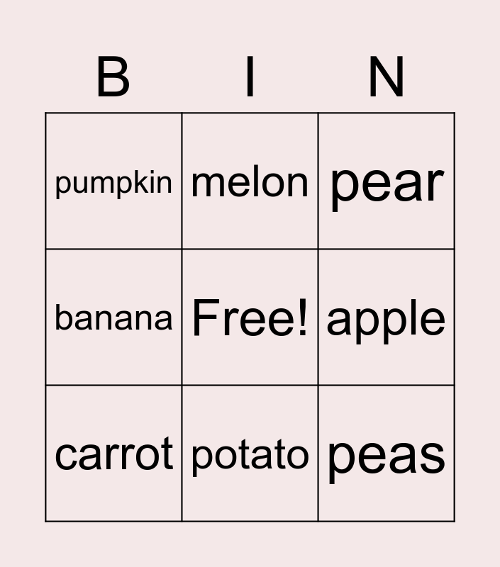 This bingo card has a free space and 8 words: apple, pear, melon, carrot, pumpkin, peas, banana and potato.