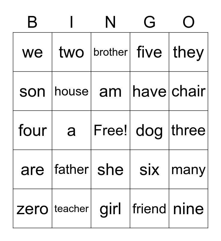 This bingo card has a free space and 24 words: father, teacher, am, zero, they, we, son, two, dog, she, have, four, six, many, house, friend, three, brother, chair, a, nine, are, five and girl.