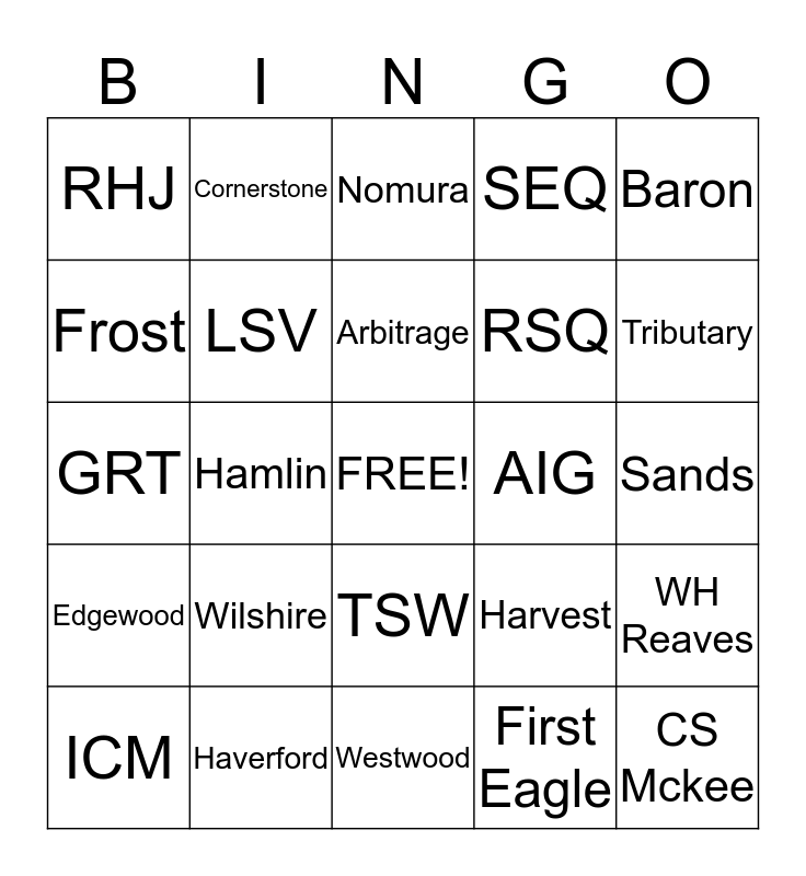 This bingo card has a free space and 24 words: Wilshire, Haverford, Arbitrage, ICM, Baron, RHJ, Frost, Cornerstone, AIG, TSW, RSQ, GRT, Harvest, WH Reaves, LSV, First Eagle, Sands, Nomura, Tributary, Hamlin, CS Mckee, Edgewood, SEQ and Westwood.