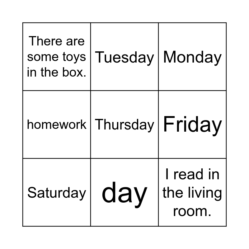 This bingo card has 16 words: What do you do in the living room?, I don't like the basement., Monday, There are some toys in the box., I read in the living room., Tuesday, I take a shower in the bathroom., Wednesday, Thursday, Friday, weekend, homework, tomorrow, day, Saturday and Sunday.