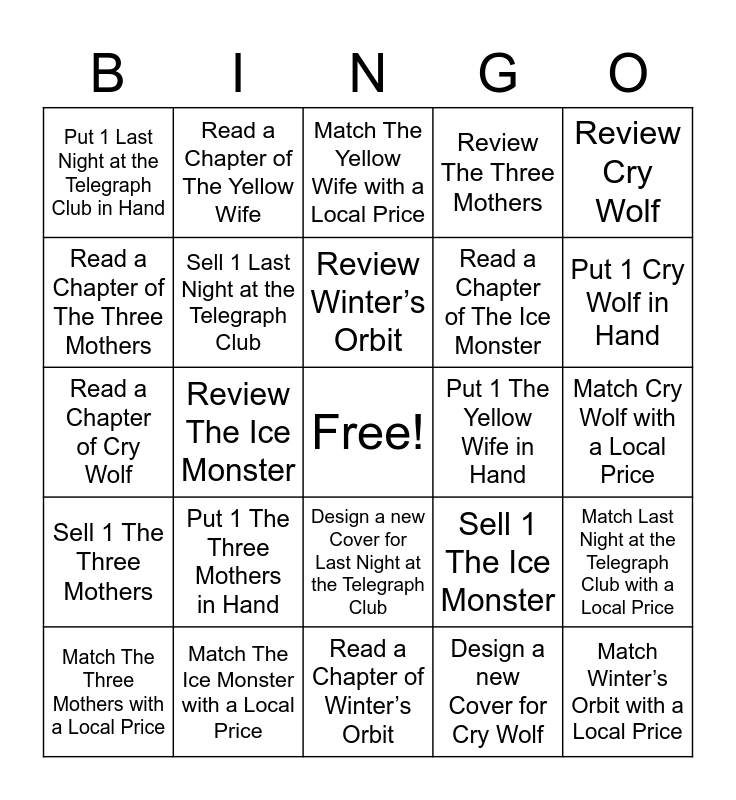 This bingo card has a free space and 36 words: Sell 1 Winter’s Orbit, Sell 1 The Yellow Wife, Sell 1 Cry Wolf, Sell 1 Last Night at the Telegraph Club, Sell 1 The Ice Monster, Sell 1 The Three Mothers, Review Winter’s Orbit, Review The Yellow Wife, Review Cry Wolf, Review Last Night at the Telegraph Club, Review The Ice Monster, Review The Three Mothers, Put 1 Winter’s Orbit in Hand, Put 1 The Yellow Wife in Hand, Put 1 Cry Wolf in Hand, Put 1 Last Night at the Telegraph Club in Hand, Put 1 The Ice Monster in Hand, Put 1 The Three Mothers in Hand, Match Winter’s Orbit with a Local Price, Match The Yellow Wife with a Local Price, Match Cry Wolf with a Local Price, Match Last Night at the Telegraph Club with a Local Price, Match The Ice Monster with a Local Price, Match The Three Mothers with a Local Price, Read a Chapter of Winter’s Orbit, Read a Chapter of The Yellow Wife, Read a Chapter of Cry Wolf, Read a Chapter of Last Night at the Telegraph Club, Read a Chapter of The Ice Monster, Read a Chapter of The Three Mothers, Design a new Cover for Winter’s Orbit, Design a new Cover for The Yellow Wife, Design a new Cover for Cry Wolf, Design a new Cover for Last Night at the Telegraph Club, Design a new Cover for The Ice Monster and Design a new Cover for The Three Mothers.