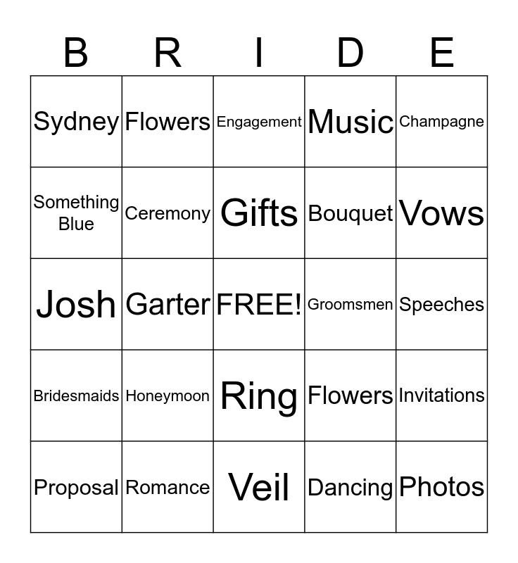 This bingo card has a free space and 24 words: Honeymoon, Romance, Gifts, Proposal, Champagne, Sydney, Something Blue, Flowers, Groomsmen, Ring, Bouquet, Josh, Flowers, Invitations, Ceremony, Dancing, Speeches, Engagement, Vows, Garter, Photos, Bridesmaids, Music and Veil.