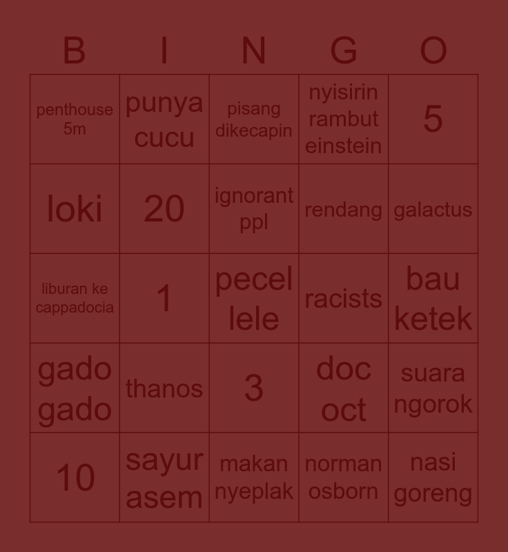 This bingo card has 25 words: thanos, makan nyeplak, ignorant ppl, 10, 5, penthouse 5m, loki, punya cucu, racists, 3, rendang, liburan ke cappadocia, doc oct, suara ngorok, 20, nasi goreng, bau ketek, pisang dikecapin, galactus, 1, pecel lele, sayur asem, gado gado, nyisirin rambut einstein and norman osborn.
