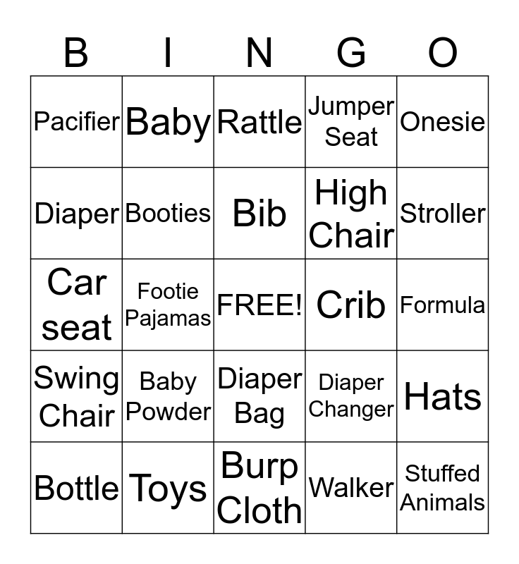 This bingo card has a free space and 25 words: Baby Powder, Burp Cloth, Bib, Bottle, Onesie, Pacifier, Diaper, Baby, Crib, Diaper Bag, High Chair, Car seat, Diaper Changer, Hats, Booties, Boutiques, Formula, Rattle, Stroller, Footie Pajamas, Stuffed Animals, Toys, Swing Chair, Jumper Seat and Walker.
