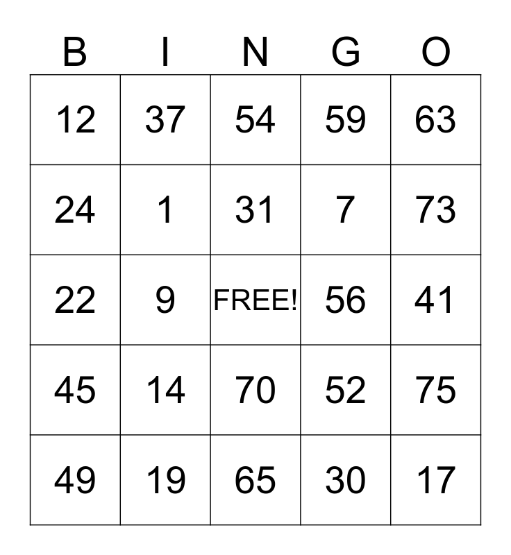 This bingo card has a free space and 24 words: 14, 19, 31, 49, 63, 12, 24, 37, 56, 70, 7, 22, 52, 75, 1, 30, 41, 54, 73, 9, 17, 45, 59 and 65.