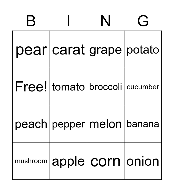 This bingo card has 16 words: apple, banana, grape, pear, peach, carat, melon, corn, Free!, tomato, mushroom, potato, pepper, cucumber, broccoli and onion.
