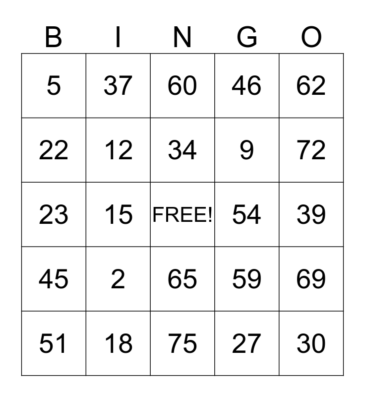 This bingo card has a free space and 24 words: 2, 18, 34, 51, 62, 5, 22, 37, 54, 65, 9, 23, 59, 69, 12, 27, 39, 60, 72, 15, 30, 45, 46 and 75.