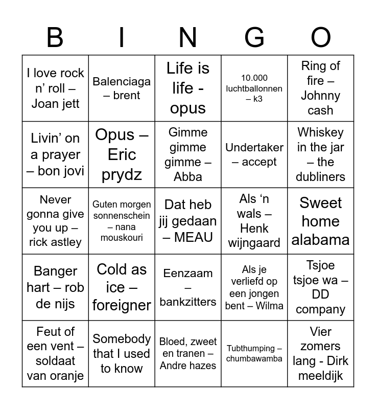 This bingo card has 49 words: Free!, Dat heb jij gedaan – MEAU, Rock you like a hurricane – Scorpions, Bloed, zweet en tranen – Andre hazes, Cold as ice – foreigner, Laat je gaan – gio swikker, Balenciaga – brent, Welcome to the jungle – guns n’ roses, Livin’ on a prayer – bon jovi, Roxanne – the police, Opus – Eric prydz, 10.000 luchtballonnen – k3, Tsjoe tsjoe wa – DD company, Als je verliefd op een jongen bent – Wilma, Mamma woar is mien pils – Normaal, Jij denkt maar dat je alles mag van mij – Frans Duijts, Gimme gimme gimme – Abba, Als ‘n wals – Henk wijngaard, Leef nu het kan – Jan smit, Ring of fire – Johnny cash, Guten morgen sonnenschein – nana mouskouri, Tubthumping – chumbawamba, I love rock n’ roll – Joan jett, Undertaker – accept, Knockin’ on heaven's door – feestteam, Whiskey in the jar – the dubliners, Feut of een vent – soldaat van oranje, Thunderstruck ac/dc, Eenzaam – bankzitters, Banger hart – rob de nijs, I was made for loving you – kiss, Rasputin, Let me entertain you – robbie williams, The real slim shady – eminem, Somebody that I used to know, You spin me right round, Hit the road jack -, Sweet caroline – single version, Sweet home alabama, Uptown girl, Wake me up- avicii, Het tietenlied – Kinderen voor kinderen, Vier zomers lang - Dirk meeldijk, Als je verliefd op een jongen bent - Wilma, Never gonna give you up – rick astley, Life is life - opus, Wonderwall – oasis, Im gonna be – the proclaimers and Master of puppets - metallica.