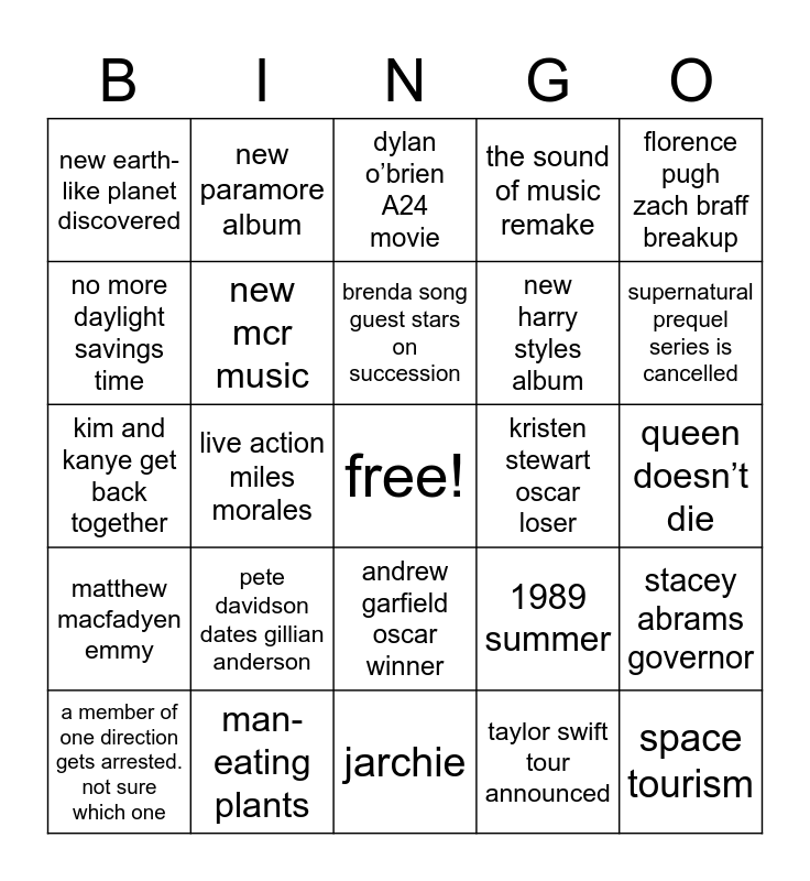 This bingo card has a free space and 24 words: pete davidson dates gillian anderson, man-eating plants, brenda song guest stars on succession, a member of one direction gets arrested. not sure which one, florence pugh zach braff breakup, new earth-like planet discovered, no more daylight savings time, new paramore album, kristen stewart oscar loser, andrew garfield oscar winner, new harry styles album, kim and kanye get back together, 1989 summer, stacey abrams governor, new mcr music, taylor swift tour announced, queen doesn’t die, dylan o’brien A24 movie, supernatural prequel series is cancelled, live action miles morales, space tourism, matthew macfadyen emmy, the sound of music remake and jarchie.