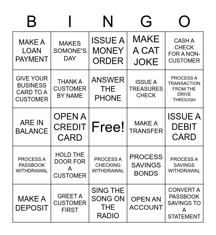 This bingo card has a free space and 24 words: HOLD THE DOOR FOR A CUSTOMER, GREET A CUSTOMER FIRST, ANSWER THE PHONE, MAKE A DEPOSIT, CASH A CHECK FOR A NON-CUSTOMER, MAKE A LOAN PAYMENT, GIVE YOUR BUSINESS CARD TO A CUSTOMER, MAKES SOMONE'S DAY, MAKE A TRANSFER, PROCESS A CHECKING WITHDRAWAL, ISSUE A TREASURES CHECK, ARE IN BALANCE, PROCESS SAVINGS BONDS, PROCESS A SAVINGS WITHDRAWAL, THANK A CUSTOMER BY NAME, OPEN AN ACCOUNT, ISSUE A DEBIT CARD, ISSUE A MONEY ORDER, PROCESS A TRANSACTION FROM THE DRIVE THROUGH, OPEN A CREDIT CARD, CONVERT A PASSBOOK SAVINGS TO A STATEMENT, PROCESS A PASSBOOK WITHDRAWAL, MAKE A CAT JOKE and SING THE SONG ON THE RADIO.