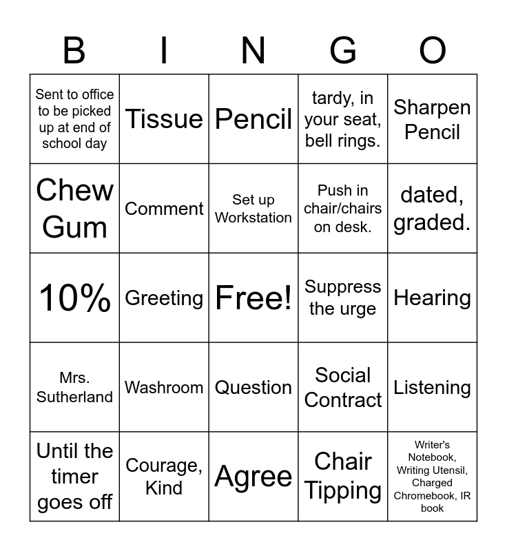 This bingo card has a free space and 24 words: Washroom, Courage, Kind, Set up Workstation, Until the timer goes off, Sharpen Pencil, Sent to office to be picked up at end of school day, Chew Gum, Tissue, Suppress the urge, Question, Push in chair/chairs on desk., 10%, Social Contract, Listening, Comment, Chair Tipping, Hearing, Pencil, dated, graded., Greeting, Writer's Notebook, Writing Utensil, Charged Chromebook, IR book, Mrs. Sutherland, tardy, in your seat, bell rings. and Agree.