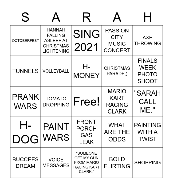 This bingo card has a free space and 24 words: PAINT WARS, VOICE MESSAGES, H-MONEY, BUCCEES DREAM, AXE THROWING, OCTOBERFEST, TUNNELS, HANNAH FALLING ASLEEP AT CHRISTMAS LIGHTENING, MARIO KART RACING CLARK, FRONT PORCH GAS LEAK, CHRISTMAS PARADE;), PRANK WARS, WHAT ARE THE ODDS, PAINTING WITH A TWIST, VOLLEYBALL, BOLD FLIRTING, "SARAH CALL ME.", SING 2021, FINALS WEEK PHOTO SHOOT, TOMATO DROPPING, SHOPPING, H-DOG, PASSION CITY MUSIC CONCERT and "SOMEONE GET MY GUN FROM MARIO RACING KART CLARK.".