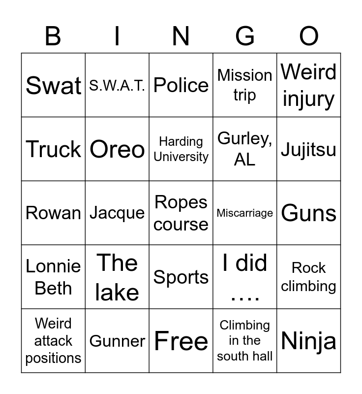 This bingo card has 25 words: Lonnie Beth, Gunner, Ropes course, Climbing in the south hall, Weird injury, Swat, S.W.A.T., Police, Miscarriage, Rock climbing, Truck, Oreo, Free, I did …., Jujitsu, Weird attack positions, Jacque, Harding University, Gurley, AL, Guns, Rowan, The lake, Sports, Mission trip and Ninja.