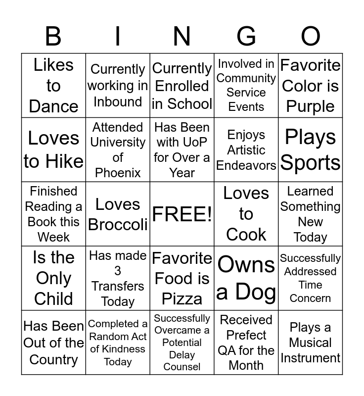 This bingo card has a free space and 24 words: Has made 3 Transfers Today, Completed a Random Act of Kindness Today, Has Been with UoP for Over a Year, Has Been Out of the Country, Favorite Color is Purple, Likes to Dance, Loves to Hike, Currently working in Inbound, Loves to Cook, Favorite Food is Pizza, Enjoys Artistic Endeavors, Finished Reading a Book this Week, Owns a Dog, Successfully Addressed Time Concern, Attended University of Phoenix, Received Prefect QA for the Month, Learned Something New Today, Currently Enrolled in School, Plays Sports, Loves Broccoli, Plays a Musical Instrument, Is the Only Child, Involved in Community Service Events and Successfully Overcame a Potential Delay Counsel.