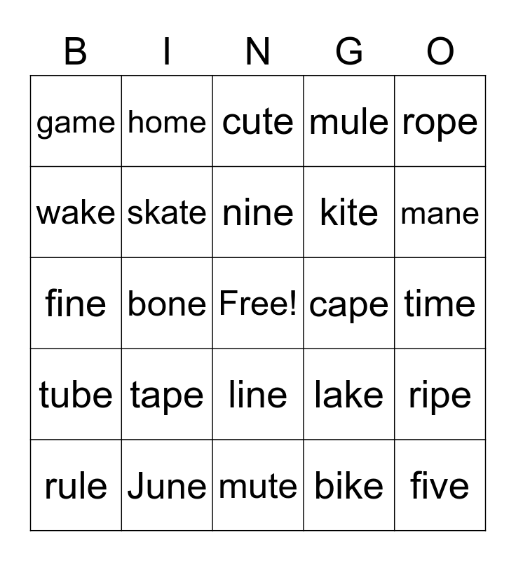 This bingo card has a free space and 24 words: tape, June, nine, rule, rope, game, wake, home, cape, line, kite, fine, lake, ripe, skate, bike, time, cute, mane, bone, five, tube, mule and mute.