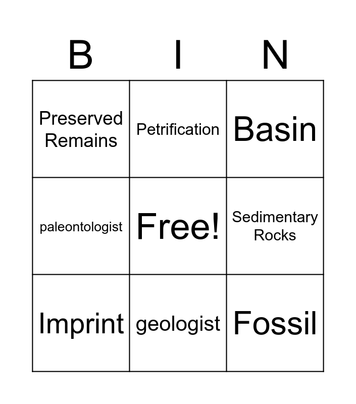 This bingo card has a free space and 8 words: Sedimentary Rocks, Basin, Petrification, Imprint, Preserved Remains, Fossil, paleontologist and geologist.