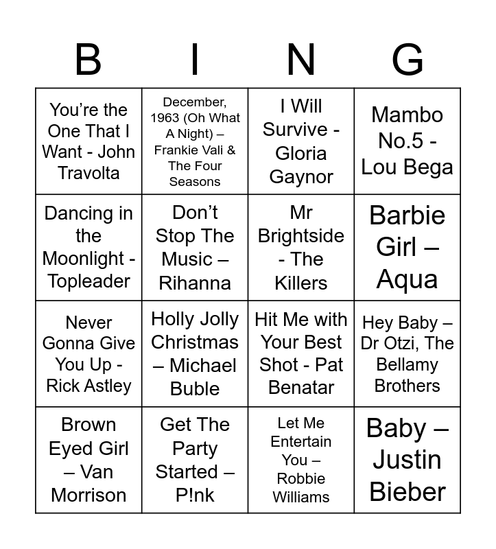 This bingo card has 16 words: Get The Party Started – P!nk, Hey Baby – Dr Otzi, The Bellamy Brothers, I Will Survive - Gloria Gaynor, You’re the One That I Want - John Travolta, Never Gonna Give You Up - Rick Astley, December, 1963 (Oh What A Night) – Frankie Vali & The Four Seasons, Hit Me with Your Best Shot - Pat Benatar, Let Me Entertain You – Robbie Williams, Dancing in the Moonlight - Topleader, Don’t Stop The Music – Rihanna, Brown Eyed Girl – Van Morrison, Mambo No.5 - Lou Bega, Holly Jolly Christmas – Michael Buble, Barbie Girl – Aqua, Mr Brightside - The Killers and Baby – Justin Bieber.