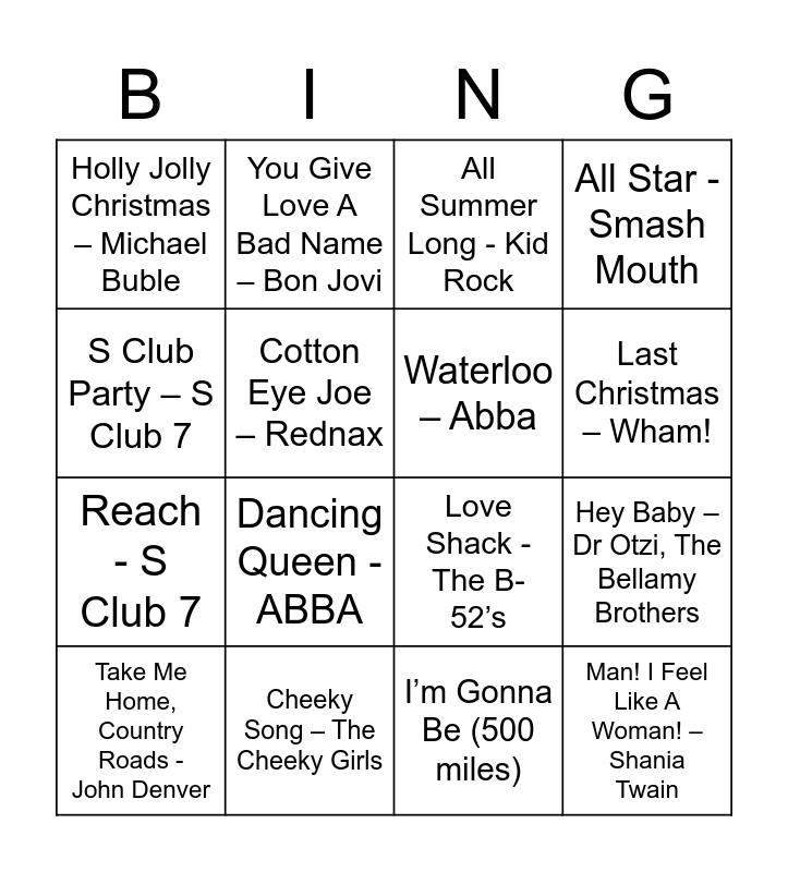 This bingo card has 16 words: Cheeky Song – The Cheeky Girls, Hey Baby – Dr Otzi, The Bellamy Brothers, All Summer Long - Kid Rock, Holly Jolly Christmas – Michael Buble, Reach - S Club 7, You Give Love A Bad Name – Bon Jovi, Love Shack - The B-52’s, I’m Gonna Be (500 miles), S Club Party – S Club 7, Cotton Eye Joe – Rednax, Take Me Home, Country Roads - John Denver, All Star - Smash Mouth, Dancing Queen - ABBA, Last Christmas – Wham!, Waterloo – Abba and Man! I Feel Like A Woman! – Shania Twain.