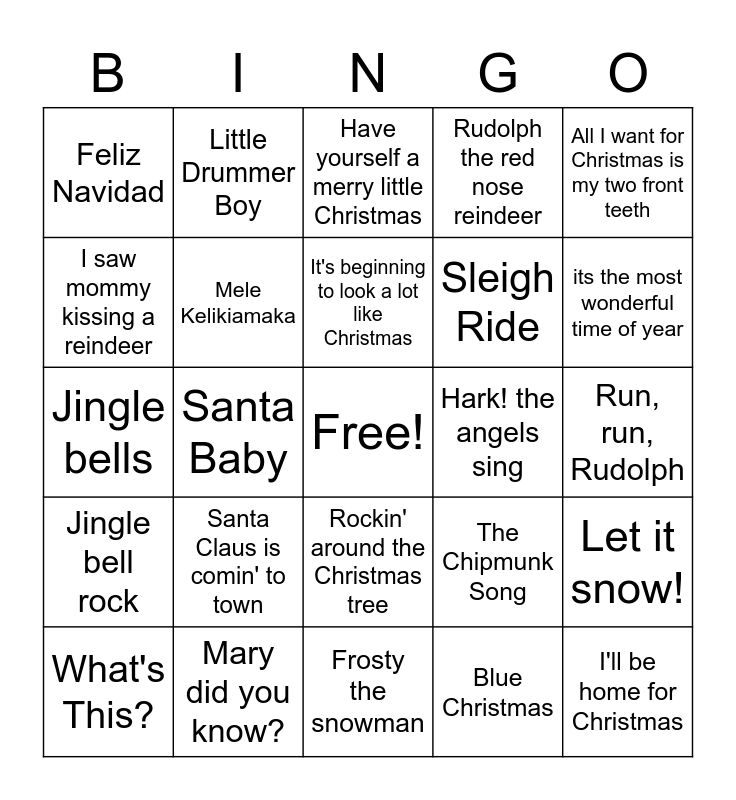 This bingo card has a free space and 24 words: Santa Claus is comin' to town, Mary did you know?, It's beginning to look a lot like Christmas, What's This?, All I want for Christmas is my two front teeth, Feliz Navidad, I saw mommy kissing a reindeer, Little Drummer Boy, Hark! the angels sing, Rockin' around the Christmas tree, Sleigh Ride, Jingle bells, The Chipmunk Song, Let it snow!, Mele Kelikiamaka, Blue Christmas, Run, run, Rudolph, Have yourself a merry little Christmas, its the most wonderful time of year, Santa Baby, I'll be home for Christmas, Jingle bell rock, Rudolph the red nose reindeer and Frosty the snowman.