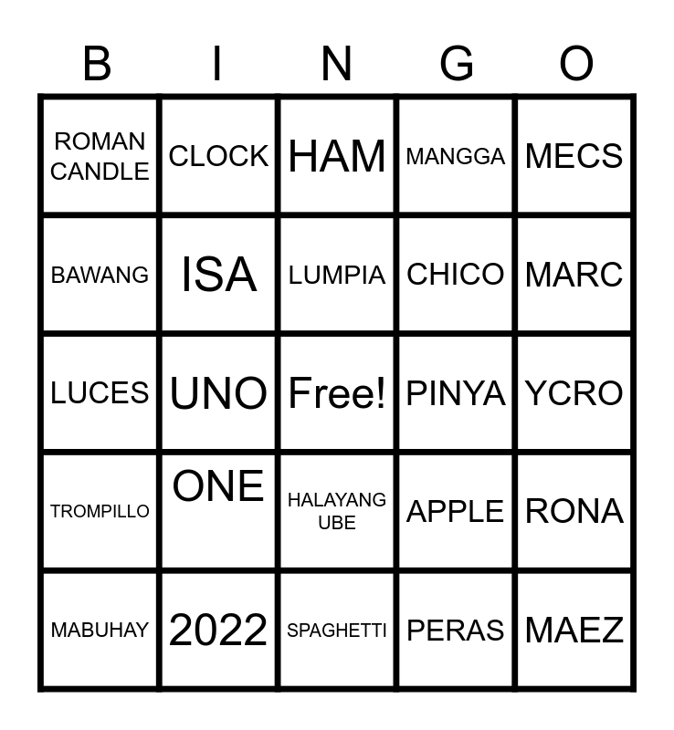 This bingo card has a free space and 24 words: MABUHAY, ONE, LUMPIA, PERAS, MECS, ROMAN CANDLE, CLOCK, HAM, PINYA, YCRO, LUCES, ISA, APPLE, RONA, BAWANG, 2022, SPAGHETTI, MANGGA, MARC, TROMPILLO, UNO, HALAYANG UBE, CHICO and MAEZ.
