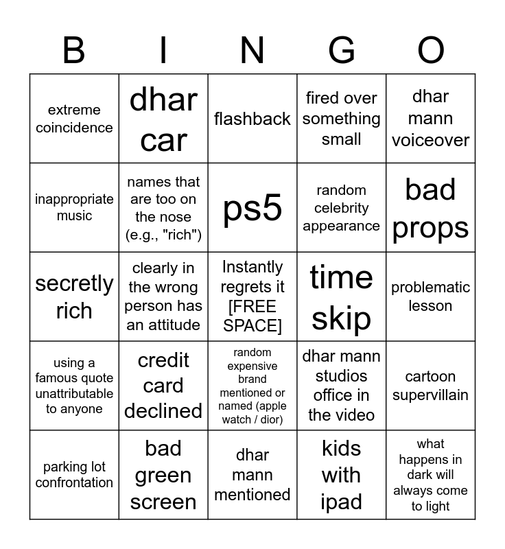 This bingo card has a free space and 33 words: "how would you feel if that happened to you?", child with unrealistic emotional maturity, clearly in the wrong person has an attitude, random dramatic and emotional monologue, using a famous quote unattributable to anyone, names that are too on the nose (e.g., "rich"), dhar mann voiceover, parking lot confrontation, dhar car, "you see" / "so you see", ps5, flashback, husband is fired, merch in video, time skip, bad props, bad green screen, secretly rich, credit card declined, dhar mann studios office in the video, random expensive brand mentioned or named (apple watch / dior), unreasonably calm & forgiving, extreme coincidence, problematic lesson, dhar mann mentioned, what happens in dark will always come to light, fired over something small, random celebrity appearance, inappropriate music, cartoon supervillain, someone gets evicted, kids with ipad and sexism.