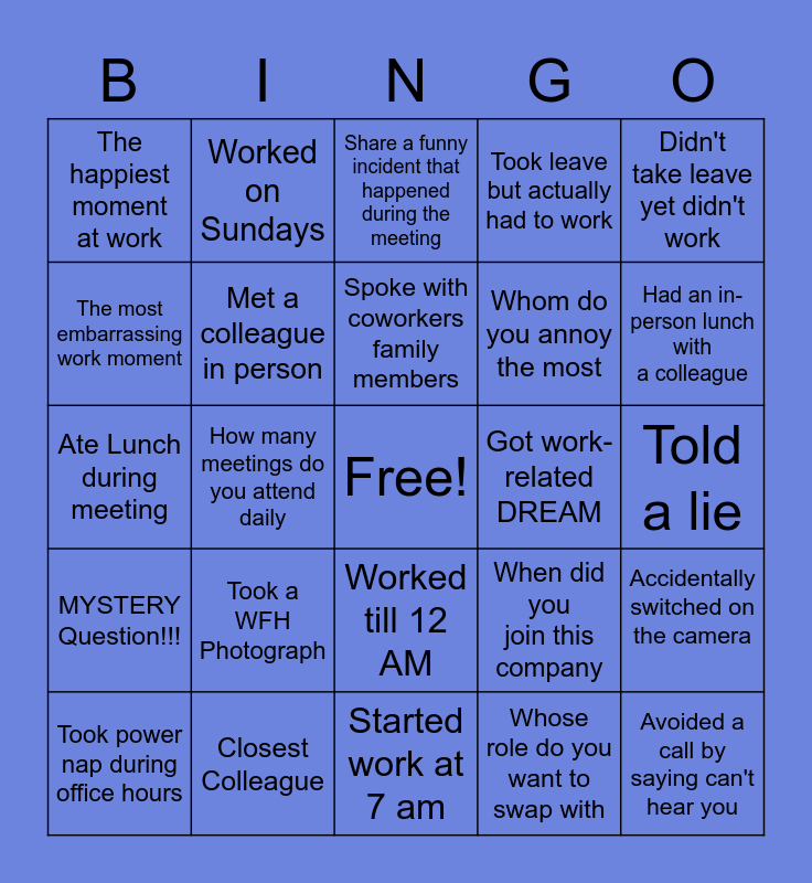 This bingo card has a free space and 24 words: Took a WFH Photograph, Closest Colleague, Spoke with coworkers family members, Took power nap during office hours, Didn't take leave yet didn't work, The happiest moment at work, The most embarrassing work moment, Worked on Sundays, Got work-related DREAM, Worked till 12 AM, Whom do you annoy the most, Ate Lunch during meeting, When did you join this company, Accidentally switched on the camera, Met a colleague in person, Whose role do you want to swap with, Told a lie, Share a funny incident that happened during the meeting, Had an in-person lunch with a colleague, How many meetings do you attend daily, Avoided a call by saying can't hear you, MYSTERY Question!!!, Took leave but actually had to work and Started work at 7 am.