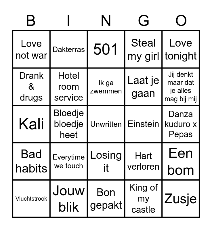 This bingo card has 47 words: Free!, Vluchtstrook, Dat heb jij gedaan, Bon gepakt, Einstein, Adem je in, Love not war, Hans betaald de schade, 501, King of my castle, Love tonight, Kali, Everytime we touch, Losing it, Streken van een duivel, Blijven slapen, Bad habits, Bloedje bloedje heet, Beach Vibe, Steal my girl, Danza kuduro x Pepas, One night stand, Dakterras, Ik ga zwemmen, Fireball, Jij denkt maar dat je alles mag bij mij, Rood, Diamant, Unwritten, Laat je gaan, Als de morgen is gekomen, klaar voor de start, Witte tjaabo, Touch it, Feest op de camping, Een bom, UHUH, Jouw blik, Rampeneren, Hart verloren, Zusje, Drank & drugs, Hotel room service, Bootje, Traitor, Hot N cold and You belong with me.