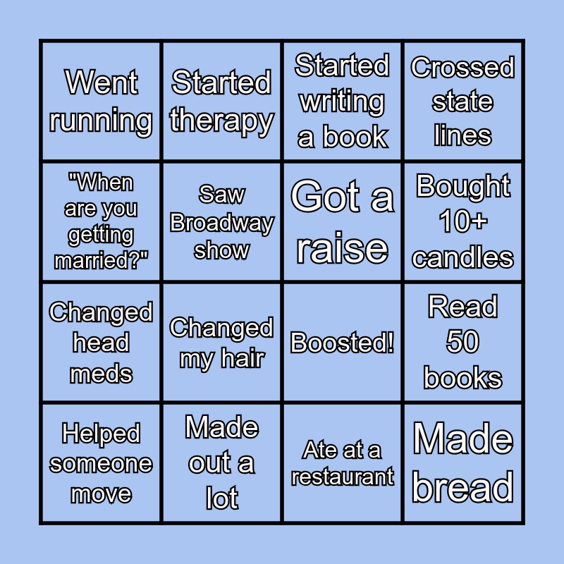 This bingo card has 16 words: Made out a lot, Read 50 books, Started writing a book, Went running, Changed head meds, Started therapy, Boosted!, Ate at a restaurant, "When are you getting married?", Saw Broadway show, Helped someone move, Crossed state lines, Changed my hair, Bought 10+ candles, Got a raise and Made bread.