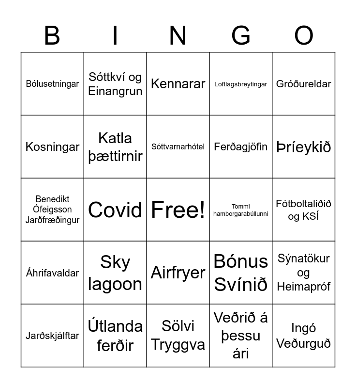 This bingo card has a free space and 29 words: Jarðskjálftar, Eldgosið, Covid, Grímur, Bólusetningar, Kennarar, Katla þættirnir, Sky lagoon, Tommi hamborgarabúllunni, Útlanda ferðir, Fótboltaliðið og KSÍ, Ingó Veðurguð, Sölvi Tryggva, Veðrið á þessu ári, Þríeykið, Bubba tónleikar, Airfryer, Áhrifavaldar, Gróðureldar, Benedikt Ófeigsson Jarðfræðingur, Bónus Svínið, Leynilögga, Ferðagjöfin, Kosningar, Loftlagsbreytingar, Sóttkví og Einangrun, Sýnatökur og Heimapróf, Sóttvarnarhótel and Fréttir og fjölmiðlar.