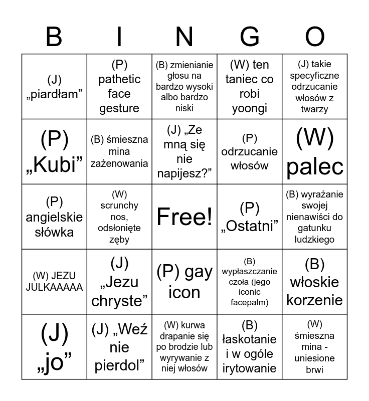 This bingo card has a free space and 24 words: (J) „Jezu chryste”, (J) „Weź nie pierdol”, (J) „Ze mną się nie napijesz?”, (J) „jo”, (J) takie specyficzne odrzucanie włosów z twarzy, (J) „piardłam”, (P) „Kubi”, (P) pathetic face gesture, (P) „Ostatni”, (P) gay icon, (P) odrzucanie włosów, (P) angielskie słówka, (B) wypłaszczanie czoła (jego iconic facepalm), (B) włoskie korzenie, (B) śmieszna mina zażenowania, (B) łaskotanie i w ogóle irytowanie, (B) wyrażanie swojej nienawiści do gatunku ludzkiego, (B) zmienianie głosu na bardzo wysoki albo bardzo niski, (W) palec, (W) scrunchy nos, odsłonięte zęby, (W) śmieszna mina - uniesione brwi, (W) JEZU JULKAAAAA, (W) ten taniec co robi yoongi and (W) kurwa drapanie się po brodzie lub wyrywanie z niej włosów.