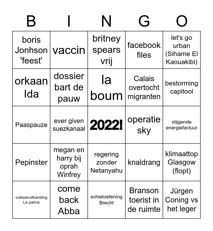 This bingo card has a free space and 33 words: het rijk van de vrijheid, militaire staatsgreep Myanmar, ever given suezkanaal, "waterval" (k3), Pepinster, dossier bart de pauw, let's go urban (Sihame El Kaouakibi), vulkaanuitbarsting La palma, vaccin, Bashir Abdi maakt ons trots (samen met 6 anderen), la boum, britney spears vrij, pensioen Merkel, exit vs uit Afganistan, operatie sky, bestorming capitool, come back Abba, Paaspauze, megan en harry bij oprah Winfrey, knaldrang, regering zonder Netanyahu, exit simone biles olympische spelen, boris Jonhson 'feest', stijgende energiefactuur, schietoefening Brecht, Jürgen Coning vs het leger, facebook files, Calais overtocht migranten, orkaan Ida, klimaattop Glasgow (flopt), pfos linkeroever, Branson toerist in de ruimte and Prinses elisabeth studeert af in het leger.