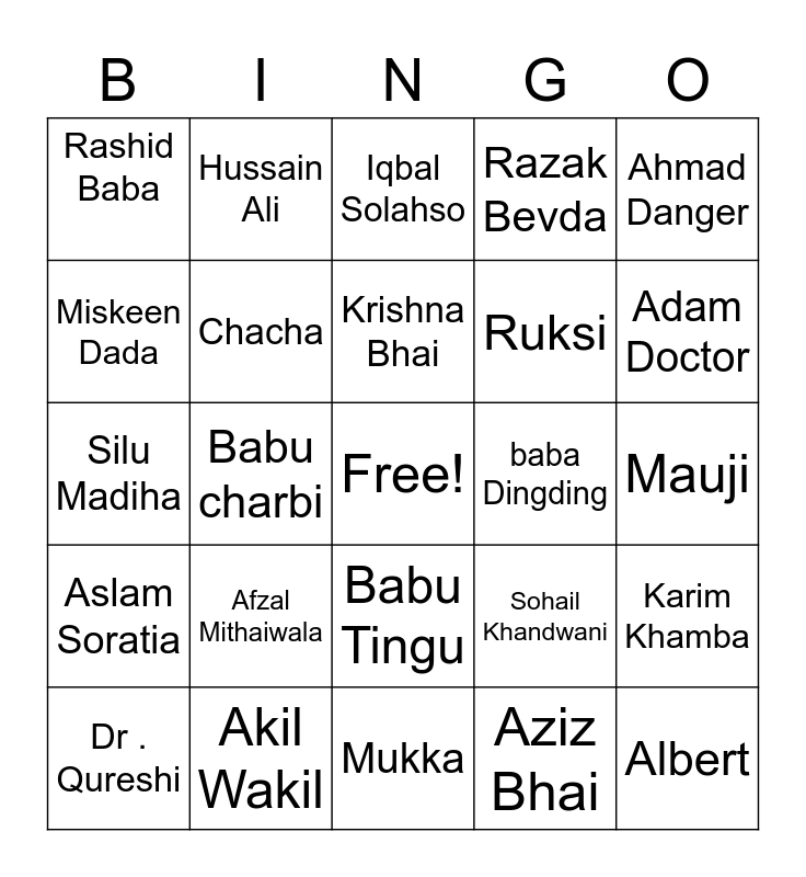 This bingo card has a free space and 29 words: Dr . Qureshi, Jaffar Langda, Babu charbi, Salim Hateli, Rashid Baba, Iqbal Solahso, Chacha, Afzal Mithaiwala, baba Dingding, Akil Wakil, Mauji, Albert, Mukka, Aziz Bhai, Adam Doctor, Atiq Patel, Babu Tingu, Aslam Soratia, Ahmad Danger, Silu Madiha, Sohail Khandwani, Gracy, Ruksi, Miskeen Dada, Razak Bevda, Hussain Ali, Karim Khamba, Krishna Bhai and Aziz Aapa.