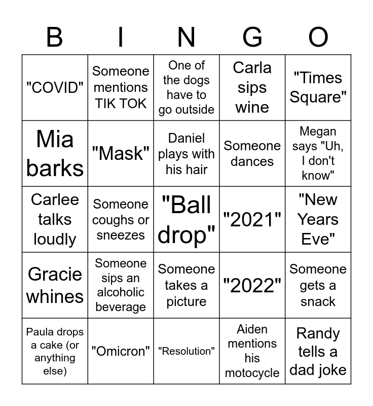 This bingo card has 25 words: Someone sips an alcoholic beverage, "Resolution", Daniel plays with his hair, Paula drops a cake (or anything else), "Times Square", "COVID", Mia barks, Someone mentions TIK TOK, "2021", Someone takes a picture, Someone dances, Carlee talks loudly, "2022", Someone gets a snack, "Mask", Randy tells a dad joke, "New Years Eve", One of the dogs have to go outside, Megan says "Uh, I don't know", Someone coughs or sneezes, "Ball drop", "Omicron", Gracie whines, Carla sips wine and Aiden mentions his motocycle.