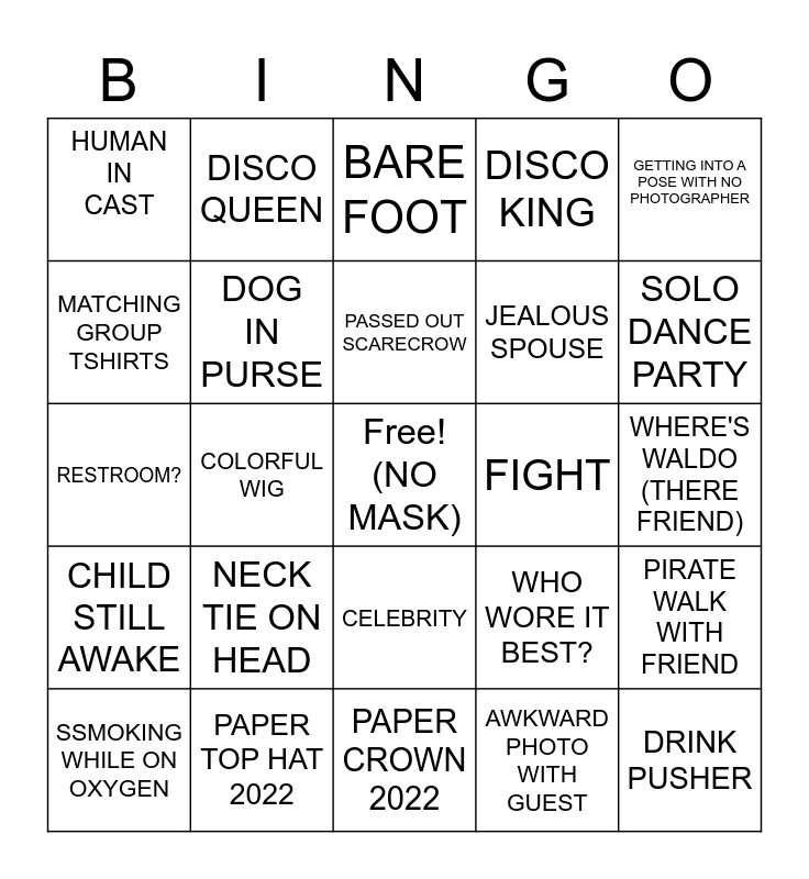 This bingo card has a free space and 24 words: SSMOKING WHILE ON OXYGEN, NECK TIE ON HEAD, PASSED OUT SCARECROW, AWKWARD PHOTO WITH GUEST, GETTING INTO A POSE WITH NO PHOTOGRAPHER, HUMAN IN CAST, DISCO QUEEN, BARE FOOT, FIGHT, WHERE'S WALDO (THERE FRIEND), RESTROOM?, DOG IN PURSE, WHO WORE IT BEST?, PIRATE WALK WITH FRIEND, MATCHING GROUP TSHIRTS, PAPER TOP HAT 2022, PAPER CROWN 2022, DISCO KING, SOLO DANCE PARTY, CHILD STILL AWAKE, COLORFUL WIG, CELEBRITY, JEALOUS SPOUSE and DRINK PUSHER.