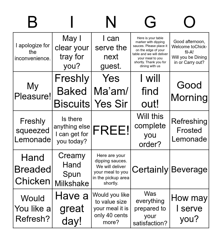 This bingo card has a free space and 24 words: Creamy Hand Spun Milkshake, Have a great day!, Yes Ma’am/ Yes Sir, Would You like a Refresh?, Good afternoon, Welcome toChick-fil-A! Will you be Dining in or Carry out?, I apologize for the inconvenience., My Pleasure!, May I clear your tray for you?, Will this complete you order?, Here are your dipping sauces. We will deliver your meal to you in the pickup area shortly., I will find out!, Freshly squeezed Lemonade, Certainly, Beverage, Freshly Baked Biscuits, Was everything prepared to your satisfaction?, Refreshing Frosted Lemonade, I can serve the next guest., Good Morning, Is there anything else I can get for you today?, How may I serve you?, Hand Breaded Chicken, Here is your table marker with dipping sauces. Please place it on the edge of your table and we will deliver your meal to you shortly. Thank you for dining with us and Would you like to value size your meal it is only 40 cents more?.