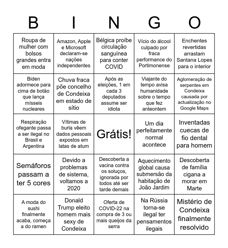 This bingo card has a free space and 24 words: Devido a problemas de sistema, voltamos a 2020, Donald Trump eleito homem mais sexy de Condeixa, Após as eleições, 1 em cada 3 deputados assume ser idiota, A moda do sushi finalmente acaba, começa a do ramen, Enchentes revertidas arrastam Santana Lopes para o interior, Roupa de mulher com bolsos grandes entra em moda, Biden adormece para cima de botão que lança mísseis nucleares, Amazon, Apple e Microsoft declaram-se nações independentes, Um dia perfeitamente normal acontece, Descoberta a vacina contra os soluços, ignorada por todos até ser tarde demais, Viajante do tempo avisa humanidade sobre o tempo que fez anteontem, Respiração ofegante passa a ser ilegal no Brasil e Argentina, Aquecimento global causa submersão da habitação de João Jardim, Descoberta de família cigana a morar em Marte, Chuva fraca põe concelho de Condeixa em estado de sítio, Na Rússia torna-se ilegal ter pensamentos ilegais, Inventadas cuecas de fio dental para homem, Bélgica proíbe circulação sanguínea para conter COVID, Aglomeração de serpentes em Condeixa causada por actualização no Google Maps, Vítimas de burla vêem dados pessoais expostos em latas de atum, Mistério de Condeixa finalmente resolvido, Semáforos passam a ter 5 cores, Vício do álcool culpado por fraca performance do Portimonense and Oferta de COVID-22 na compra de 3 ou mais queijos da serra.