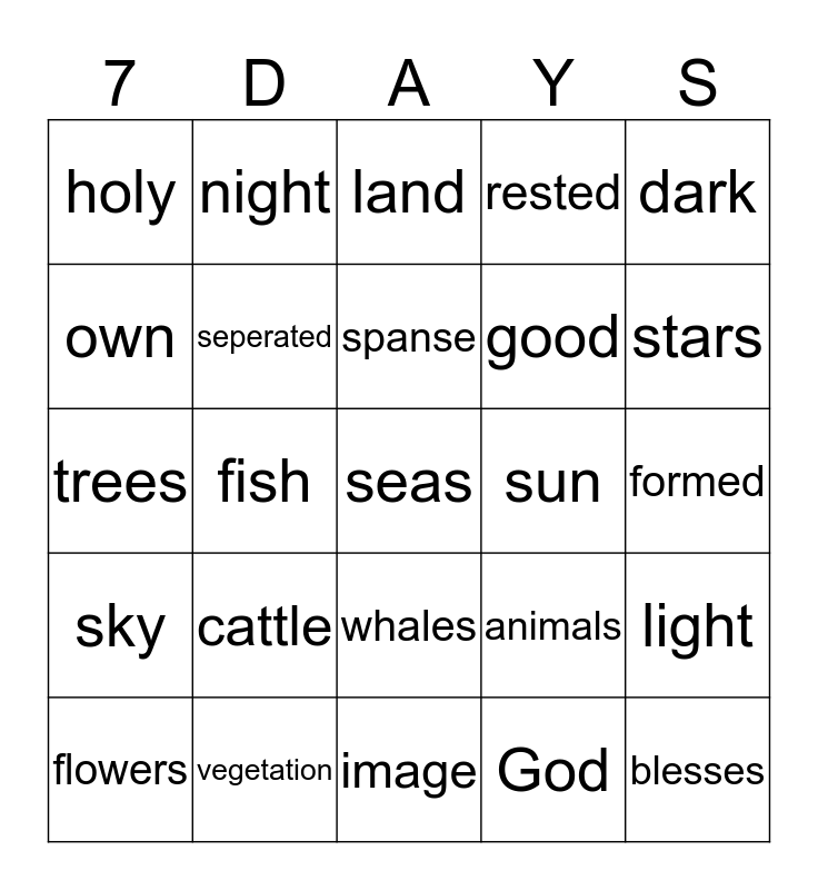 This bingo card has a free space and 32 words: God, water, fish, birds, sky, seperated, dark, light, night, day, spanse, land, moon, stars, sun, land, flowers, trees, whales, cattle, animals, man, formed, vegetation, blesses, rested, good, own, holy, image, gathered and stars.