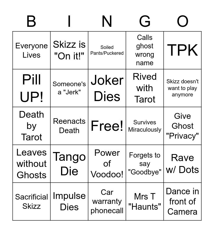 This bingo card has a free space and 24 words: Tango Die, Impulse Dies, Joker Dies, Sacrificial Skizz, TPK, Everyone Lives, Pill UP!, Skizz is "On it!", Survives Miraculously, Power of Voodoo!, Rived with Tarot, Death by Tarot, Forgets to say "Goodbye", Rave w/ Dots, Someone's a "Jerk", Mrs T "Haunts", Give Ghost "Privacy", Soiled Pants/Puckered, Skizz doesn't want to play anymore, Reenacts Death, Dance in front of Camera, Leaves without Ghosts, Calls ghost wrong name and Car warranty phonecall.