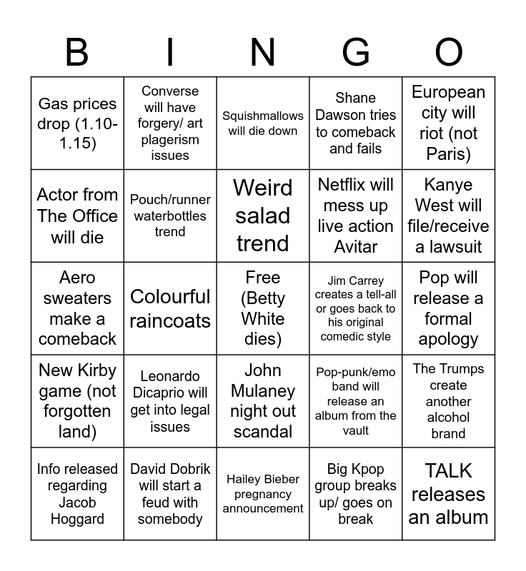 This bingo card has a free space and 24 words: Leonardo Dicaprio will get into legal issues, David Dobrik will start a feud with somebody, Weird salad trend, Info released regarding Jacob Hoggard, European city will riot (not Paris), Gas prices drop (1.10-1.15), Actor from The Office will die, Converse will have forgery/ art plagerism issues, Jim Carrey creates a tell-all or goes back to his original comedic style, John Mulaney night out scandal, Netflix will mess up live action Avitar, Aero sweaters make a comeback, Pop-punk/emo band will release an album from the vault, The Trumps create another alcohol brand, Pouch/runner waterbottles trend, Big Kpop group breaks up/ goes on break, Pop will release a formal apology, Squishmallows will die down, Kanye West will file/receive a lawsuit, Colourful raincoats, TALK releases an album, New Kirby game (not forgotten land), Shane Dawson tries to comeback and fails and Hailey Bieber pregnancy announcement.
