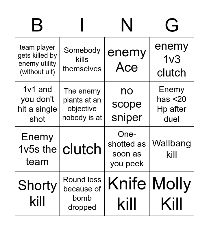 This bingo card has 25 words: Team Flash, Team goes 0-3 to start, Enemy has <20 Hp after duel, enemy team gets thrifty, 1v1 and you don't hit a single shot, team player gets killed by enemy utility (without ult), The enemy plants at an objective nobody is at, Somebody kills themselves, Round loss because of bomb dropped, Buy a sniper and get killed before shooting it, Enemy 1v5s the team, One-shotted as soon as you peek, enemy team gets flawless, AFK random, no scope sniper, Team wipe but the bomb detonates anyway, Knife kill, enemy Ace, clutch, Wallbang kill, Shorty kill, Turret Kill, Molly Kill, enemy 1v3 clutch and somebody gets Fall damage.