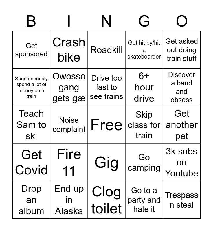 This bingo card has a free space and 24 words: Fire 11, End up in Alaska, Drive too fast to see trains, Drop an album, Get asked out doing train stuff, Get sponsored, Spontaneously spend a lot of money on a train, Crash bike, Skip class for train, Gig, 6+ hour drive, Teach Sam to ski, Go camping, 3k subs on Youtube, Owosso gang gets gæ, Go to a party and hate it, Get another pet, Roadkill, Discover a band and obsess, Noise complaint, Trespass n steal, Get Covid, Get hit by/hit a skateboarder and Clog toilet.