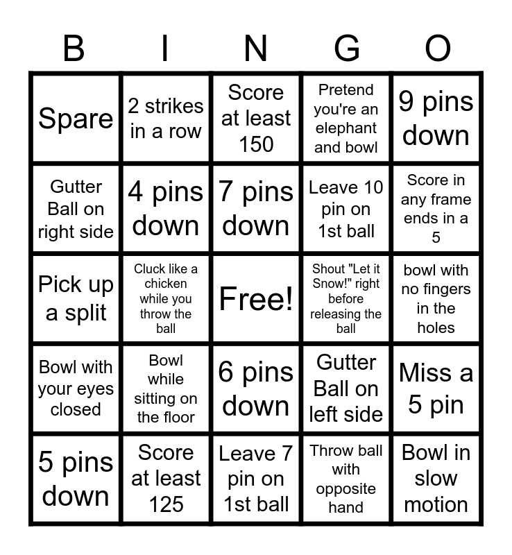 This bingo card has a free space and 39 words: 1 pin down, 2 pins down, 3 pins down, 4 pins down, 5 pins down, 6 pins down, 7 pins down, 8 pins down, 9 pins down, Bowl with your eyes closed, Cluck like a chicken while you throw the ball, Pretend you're an elephant and bowl, Bowl in slow motion, bowl with no fingers in the holes, Shout "Let it Snow!" right before releasing the ball, Bowl while sitting on the floor, Strike, Spare, Gutter Ball, Gutter Ball on left side, Gutter Ball on right side, Leave 7 pin on 1st ball, Leave 10 pin on 1st ball, Score in any frame ends in a 5, Score in any frame ends in a 6, Score in any frame ends in a 7, Score in any frame ends in a 8, Score in any frame ends in a 9, Score in any frame ends in a 0, 2 strikes in a row, Turkey, 2 spares in a row, Score at least 150, Score at least 125, Throw ball with opposite hand, Throw ball backwards between legs, Miss a 5 pin, Pick up a split and Leave the 1 pin.