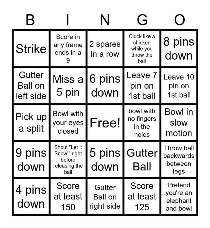 This bingo card has a free space and 39 words: 1 pin down, 2 pins down, 3 pins down, Miss a 5 pin, 4 pins down, 5 pins down, 6 pins down, 7 pins down, 8 pins down, 9 pins down, Bowl with your eyes closed, Cluck like a chicken while you throw the ball, Pretend you're an elephant and bowl, Bowl in slow motion, bowl with no fingers in the holes, Shout "Let it Snow!" right before releasing the ball, Bowl while sitting on the floor, Strike, Spare, Gutter Ball, Gutter Ball on left side, Gutter Ball on right side, Leave 7 pin on 1st ball, Leave 10 pin on 1st ball, Turkey, Score in any frame ends in a 5, Score in any frame ends in a 6, Score in any frame ends in a 7, Score in any frame ends in a 8, Score in any frame ends in a 9, Score in any frame ends in a 0, 2 strikes in a row, 2 spares in a row, Score at least 150, Score at least 125, Throw ball with opposite hand, Throw ball backwards between legs, Pick up a split and Leave the 1 pin.