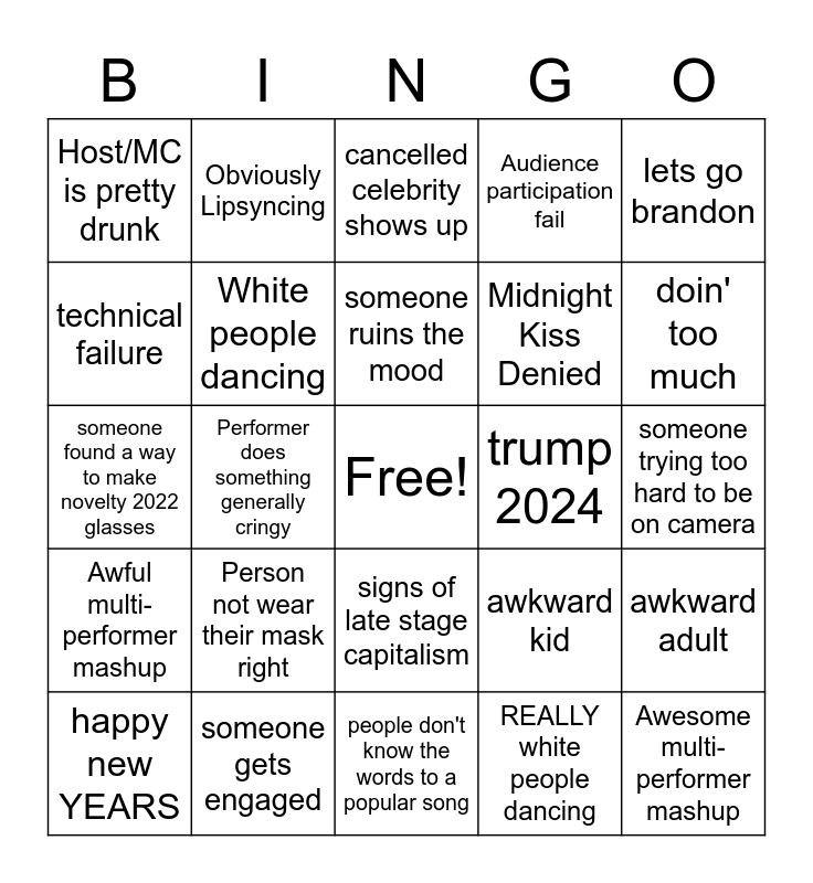 This bingo card has a free space and 24 words: Person not wear their mask right, someone gets engaged, someone ruins the mood, happy new YEARS, lets go brandon, Host/MC is pretty drunk, technical failure, Obviously Lipsyncing, trump 2024, signs of late stage capitalism, Midnight Kiss Denied, someone found a way to make novelty 2022 glasses, awkward kid, awkward adult, White people dancing, REALLY white people dancing, someone trying too hard to be on camera, cancelled celebrity shows up, doin' too much, Performer does something generally cringy, Awesome multi-performer mashup, Awful multi-performer mashup, Audience participation fail and people don't know the words to a popular song.
