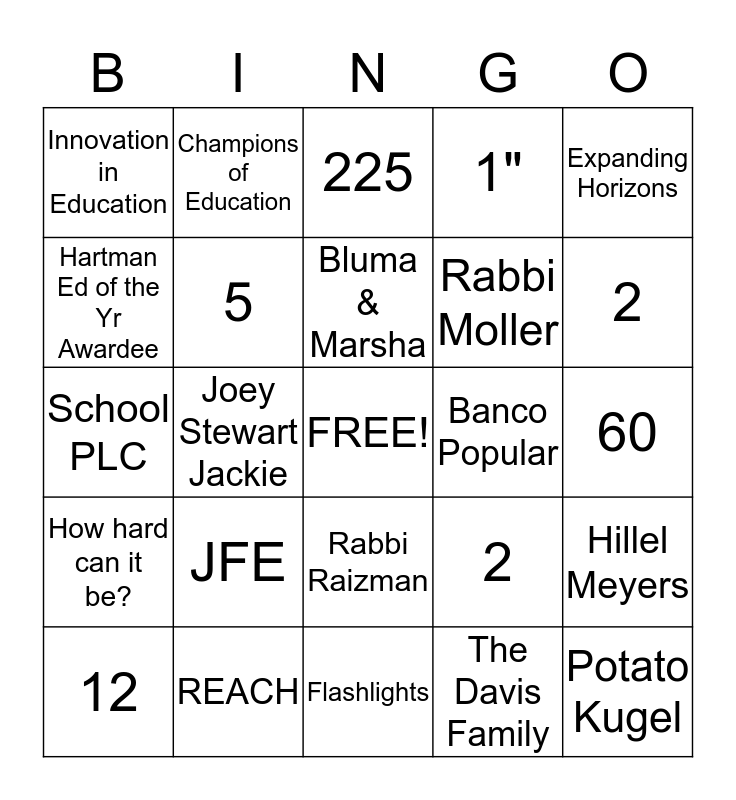 This bingo card has a free space and 24 words: JFE, REACH, Bluma & Marsha, 12, Expanding Horizons, Innovation in Education, Hartman Ed of the Yr Awardee, Champions of Education, Banco Popular, Rabbi Raizman, Rabbi Moller, School PLC, 2, Hillel Meyers, 5, The Davis Family, 60, 225, 2, Joey Stewart Jackie, Potato Kugel, How hard can it be?, 1" and Flashlights.