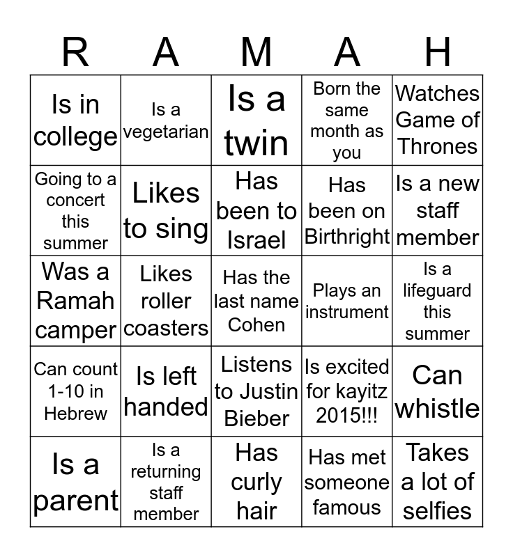 This bingo card has 25 words: Is left handed, Has curly hair, Has been to Israel, Is a parent, Watches Game of Thrones, Is in college, Going to a concert this summer, Is a vegetarian, Plays an instrument, Listens to Justin Bieber, Has been on Birthright, Was a Ramah camper, Is excited for kayitz 2015!!!, Can whistle, Likes to sing, Takes a lot of selfies, Is a lifeguard this summer, Is a twin, Is a new staff member, Likes roller coasters, Has the last name Cohen, Is a returning staff member, Can count 1-10 in Hebrew, Born the same month as you and Has met someone famous.