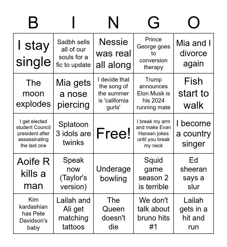 This bingo card has a free space and 24 words: Speak now (Taylor's version), Lailah and Ali get matching tattoos, I decide that the song of the summer is 'california gurls', Kim kardashian has Pete Davidson's baby, Mia and I divorce again, I stay single, The moon explodes, Sadbh sells all of our souls for a fic to update, I break my arm and make Evan Hansen jokes until you break my neck, Underage bowling, Trump announces Elon Musk is his 2024 running mate, I get elected student Council president after assassinating the last one, Squid game season 2 is terrible, Ed sheeran says a slur, Mia gets a nose piercing, We don't talk about bruno hits #1, I become a country singer, Nessie was real all along, Fish start to walk, Splatoon 3 idols are twinks, Lailah gets in a hit and run, Aoife R kills a man, Prince George goes to conversion therapy and The Queen doesn't die.