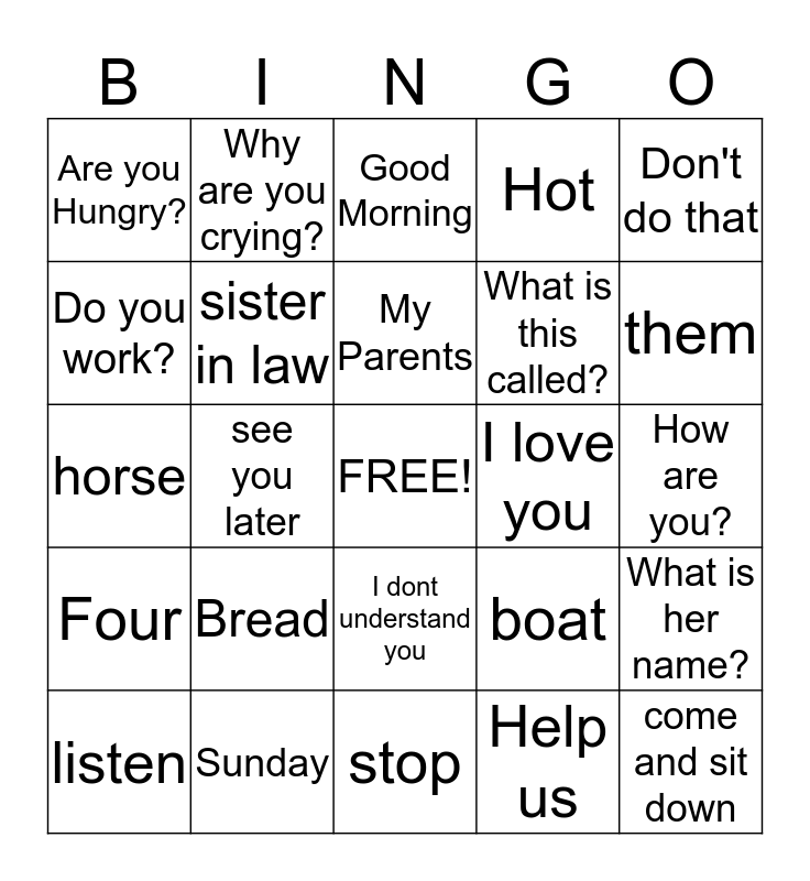 This bingo card has a free space and 25 words: Bread, stop, My Parents, listen, Don't do that, Are you Hungry?, Do you work?, Why are you crying?, I love you, I dont understand you, What is this called?, horse, boat, What is her name?, sister in law, Hungry, How are you?, Good Morning, them, see you later, come and sit down, Sunday, Four, Hot and Help us.