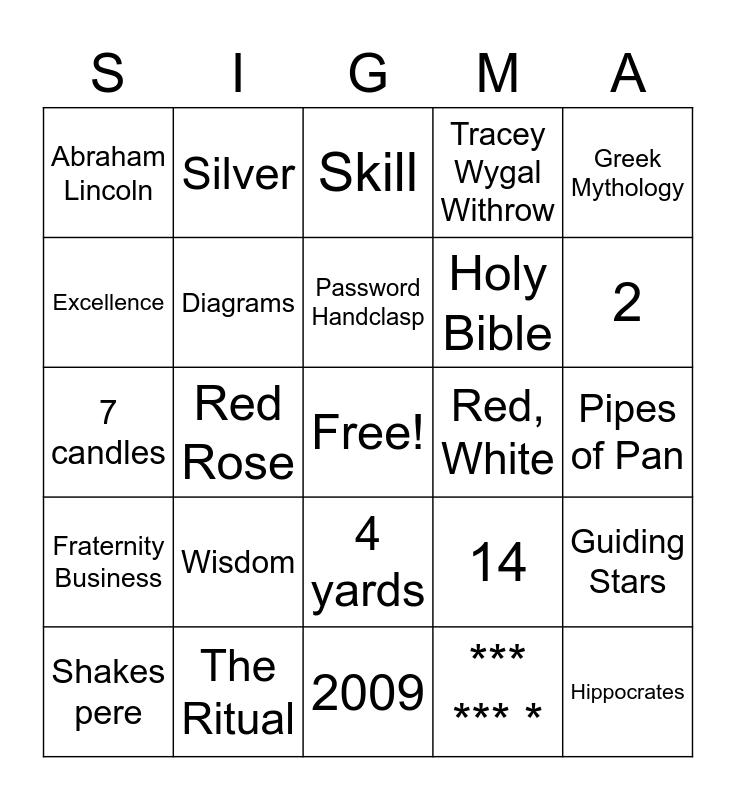 This bingo card has a free space and 24 words: Wisdom, The Ritual, Password Handclasp, Shakes pere, Greek Mythology, Abraham Lincoln, Excellence, Silver, Red, White, 4 yards, Holy Bible, 7 candles, 14, Guiding Stars, Diagrams, *** *** *, Pipes of Pan, Skill, 2, Red Rose, Hippocrates, Fraternity Business, Tracey Wygal Withrow and 2009.